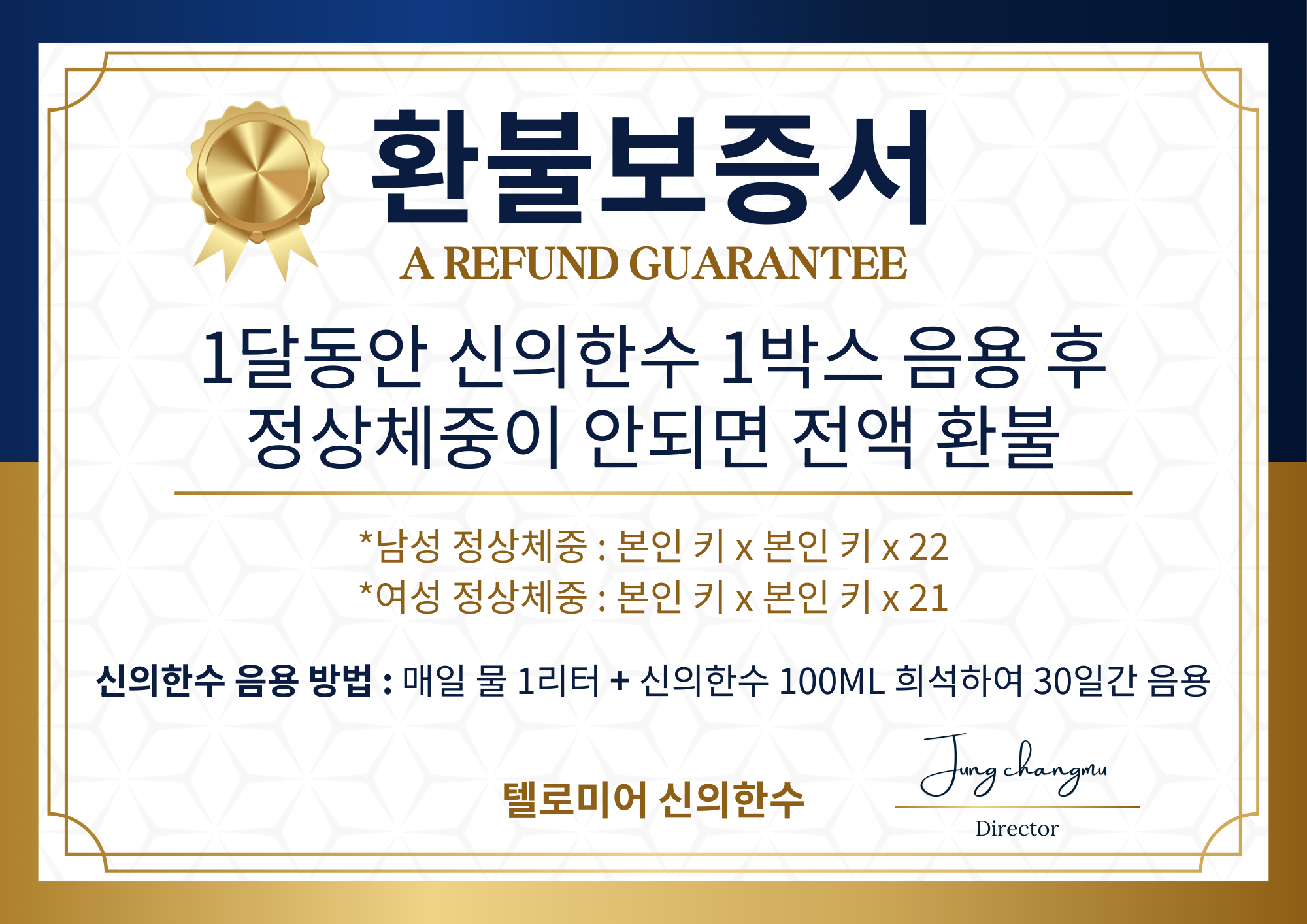 pH 12.7 이상의 초고알칼리성 제품입니다. 1000ml 물에 신의한수 50ml 희석하여 하루 총 2000ml 물을 섭취하세요.
